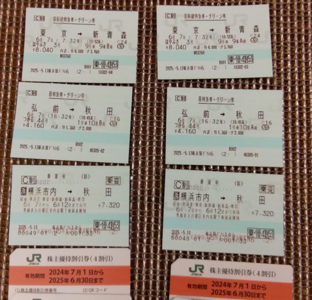 最終的に横浜市内→秋田までの乗車券と特急券・グリーン券は以下の通りとなりました。
