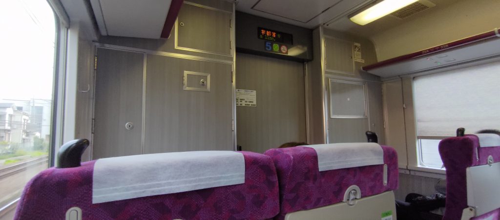早めに気づいて並んだおかげで、快速電車では座ることができました。