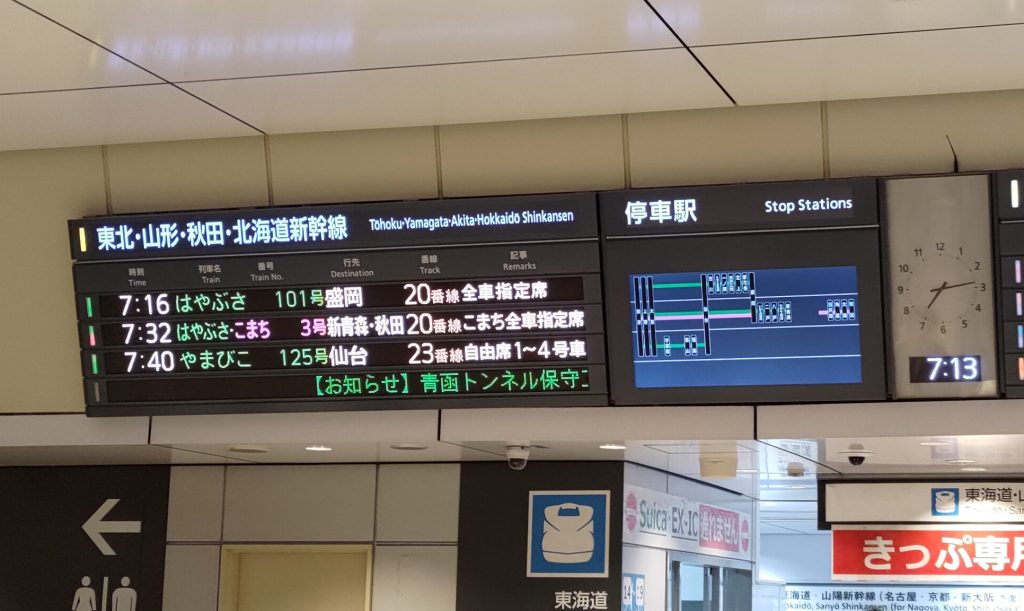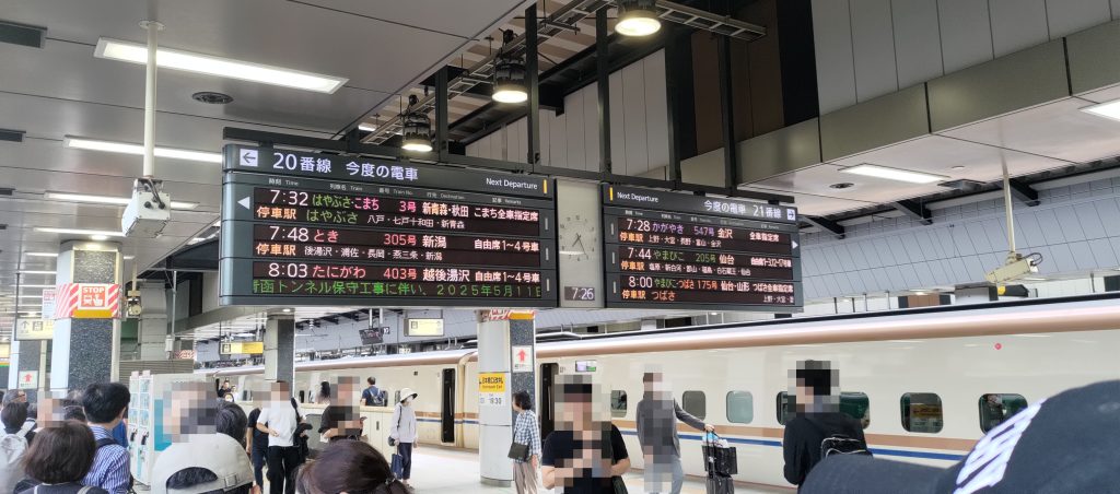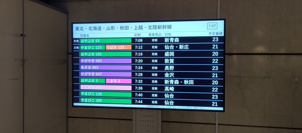 東京駅発7時台の時間帯は4分おきに新幹線が各方面に出発していきます。