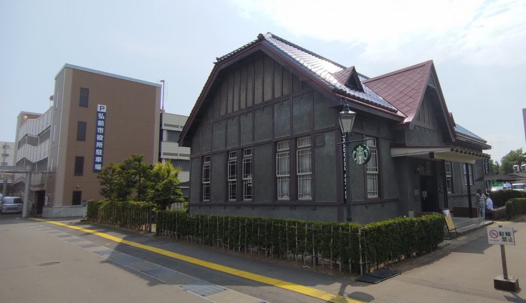 スターバックスコーヒーの弘前公園前店は大正6年(1917年)に旧陸軍第八師団長の官舎として建設され、その後弘前市長の公舎として利用された建物を利用しています。