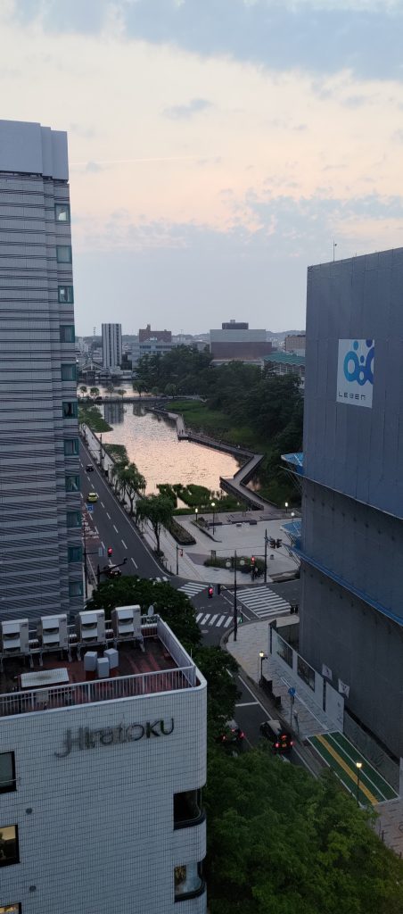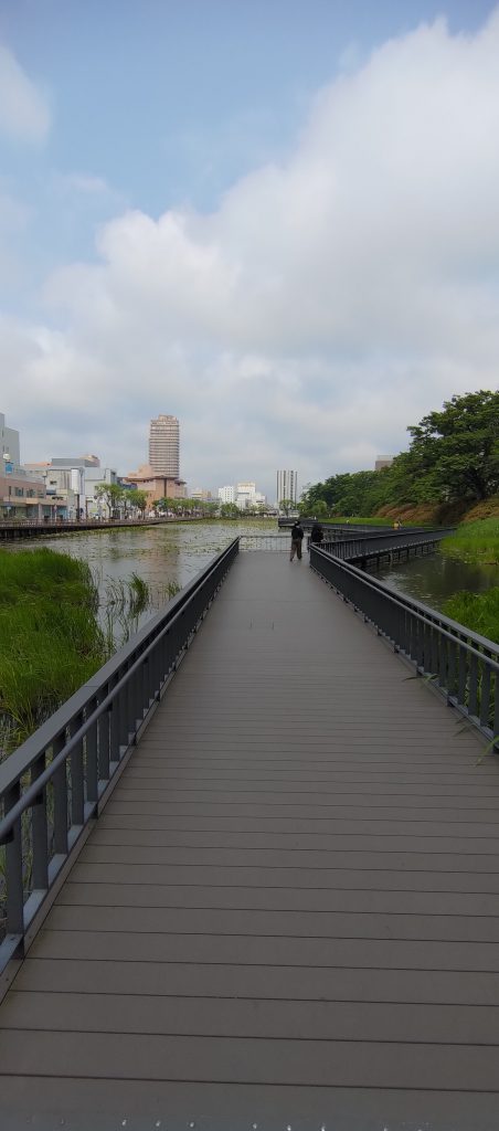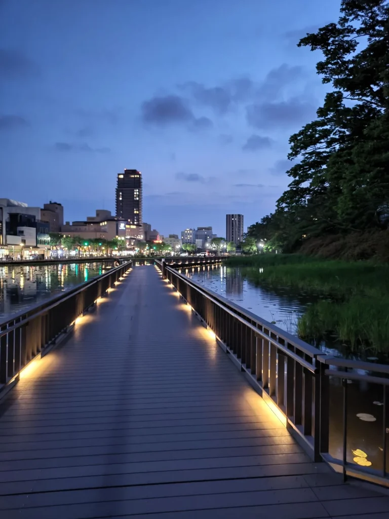 暗くなってしまったために上記の写真以外の写真は撮っていませんが、2カ月前に供用を開始したという久保田城の堀の浮橋(遊歩道)を通って、秋田市立文化創造館と秋田県立美術館の前まで行って、ホテルに戻って来ました。