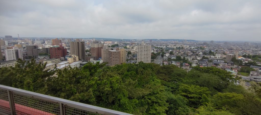 写真中央の高層マンションのさらに奥の方に後で訪れる予定の秋田大学の鉱業博物館の建物が見えます。