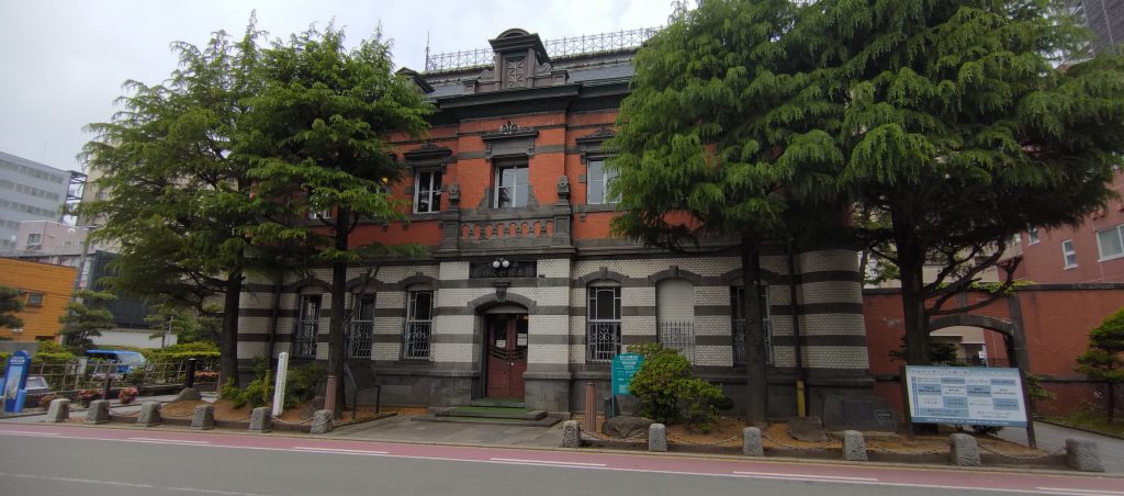 木内の前を通過して旭川に突き当たったところで左に曲がり、みずほ銀行の前の交差点を右に曲がって旭川を渡り、日本銀行の秋田支店前の交差点を左に曲がって少し歩くと、赤れんが郷土館の建物が現れます。