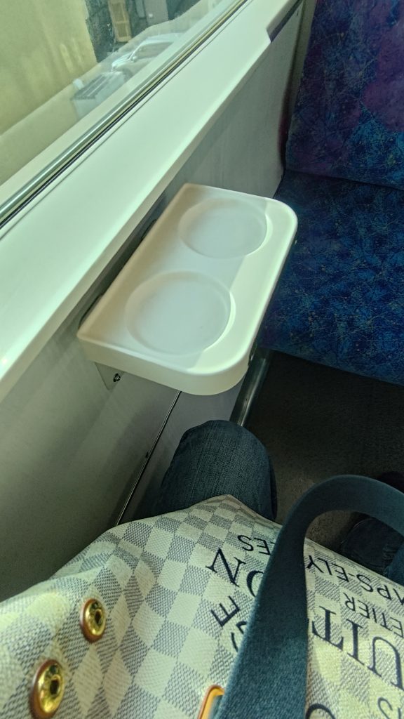 E721系1000番台の車内のクロスシートのところに設置されていたカップホルダー付きのテーブルです。