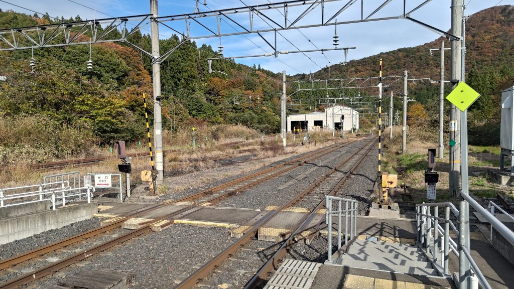 羽前千歳駅を発車してすぐに狭軌の線路と標準軌の線路が平面交差するという、営業運転を絶賛実施中の線路同士の交差としては珍しいものを見ることができますが、写真などを撮ることはできませんでした。