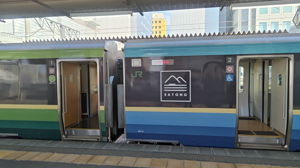 また、指定券の取得を試みるタイミングが遅れたために指定券が取れなかった「SATONO」が5分後くらいに仙台駅に向けて発車するところだったので、撮影です。