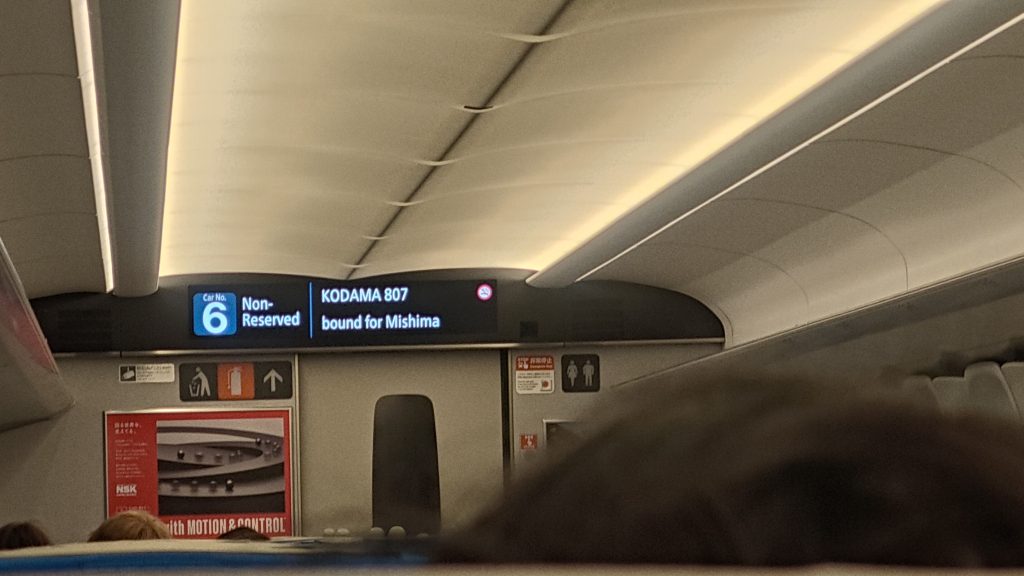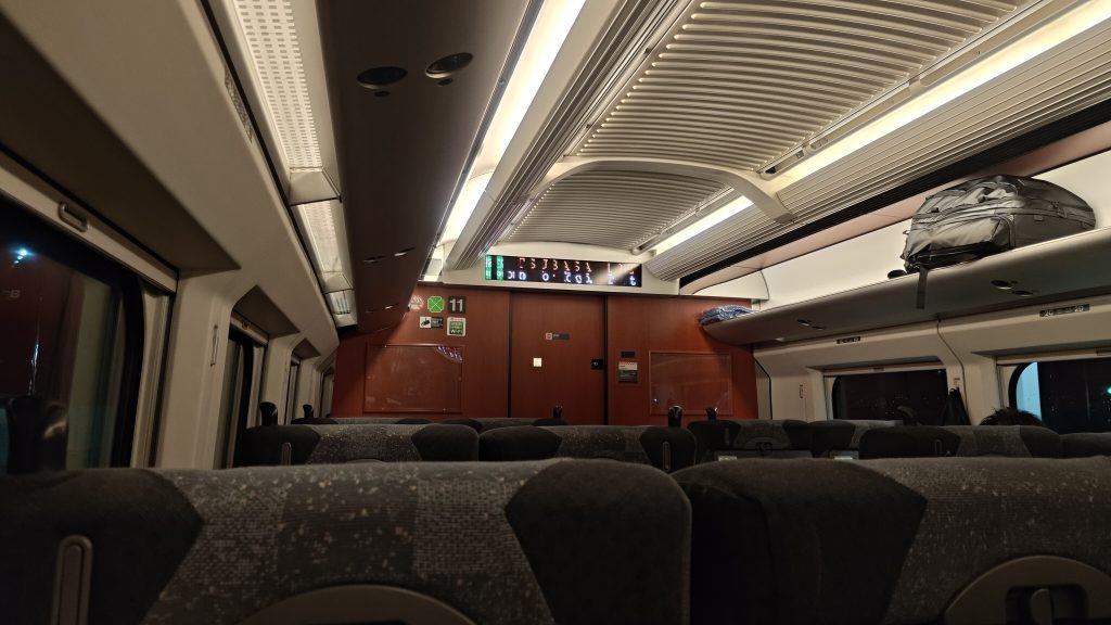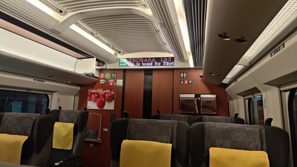 米沢駅を過ぎると紅葉がきれいな大自然の中を走っているはず…なのですが、夜間帯の走行のため外は何も見えません。