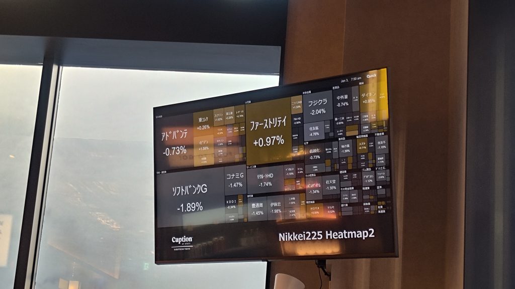 テレビ画面に日経平均の構成銘柄のヒートマップが割と長時間にわたり表示されてしまう(※この日は東京株式市場は休業日だったので、2025年の大納会時点のヒートマップと思われます。)ところは、兜町ならではといったところでしょうか。