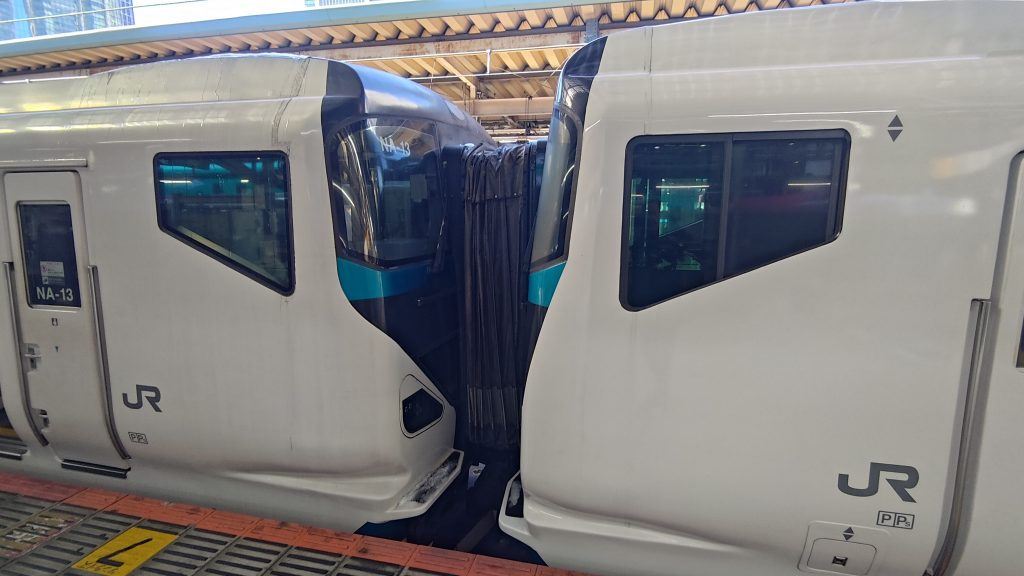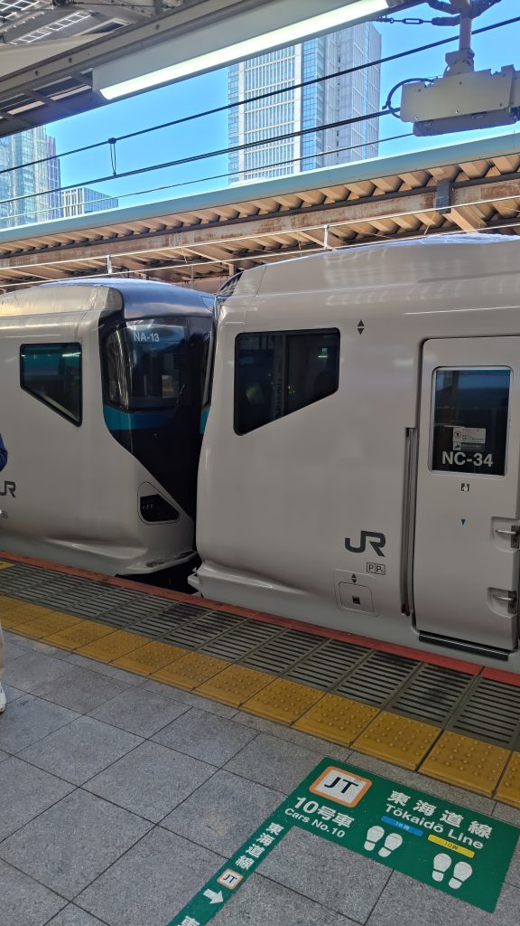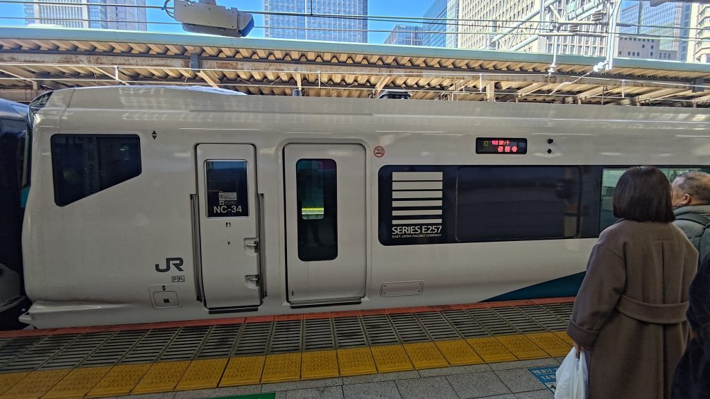 上野方からE257系2000番台の基本編成(伊豆急下田行)とE257系2500番台の付属編成(修善寺行)を連結した14両編成の列車が入線して来ました。