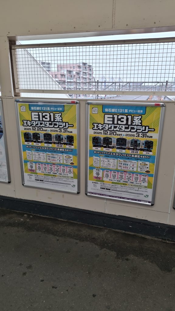 鶴見駅で広告していた「E131系エキタグスタンプラリー」の広告が茅ヶ崎駅にも掲出されていました。