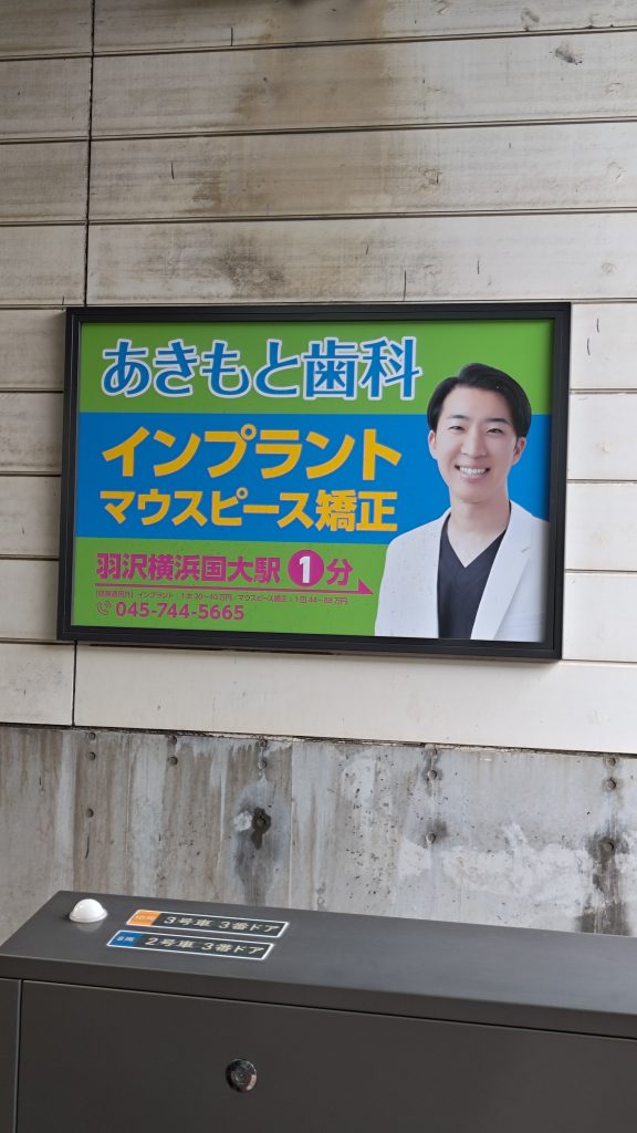 西谷駅で見かけた「あきもと歯科」の広告です。羽沢横浜国大駅の駅前にある歯科医院です。