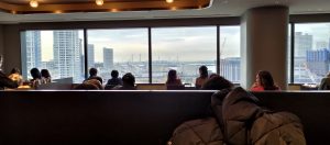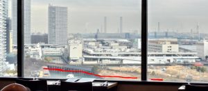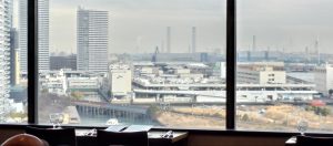 奥まった席に案内はされたものの、窓に向かって階段状の店内レイアウト(窓から離れるほど床の高さが高くなっています。)になっているため、外の景色が窓際の人にさえぎられることなくよく見えます。